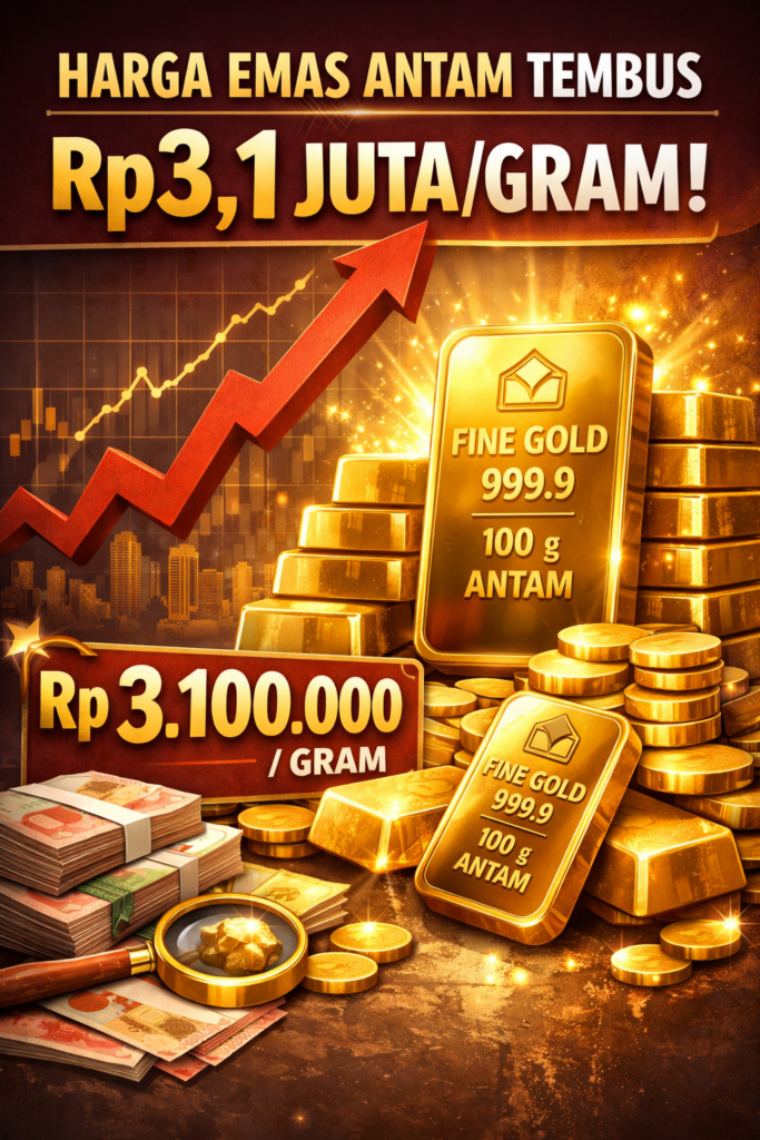 Jakarta, 29 Januari 2026 — Harga emas batangan produksi PT Aneka Tambang (Persero) Tbk (Antam) kembali mencetak rekornya. Pada perdagangan hari ini, harga jual emas Antam untuk ukuran 1 gram mencapai sekitar Rp 3.168.000, atau tembus di atas Rp 3,1 juta per gram — level tertinggi sepanjang sejarah pencatatan harga emas batangan fisik di Indonesia.